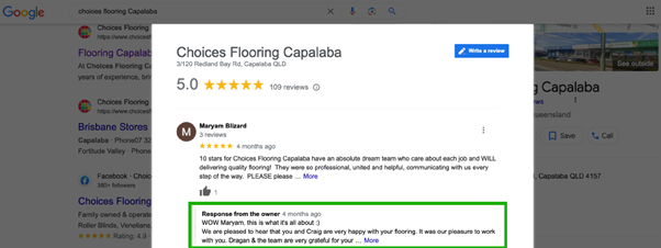 In this example from Choices Flooring Capalaba. You will notice they follow best practice by posting responses to reviews. It is recommended that as store owners / managers reply to reviews which authenticates the review post as well as illustrates to other potential customers that the business owner is engaged and responsive to customer reviews.