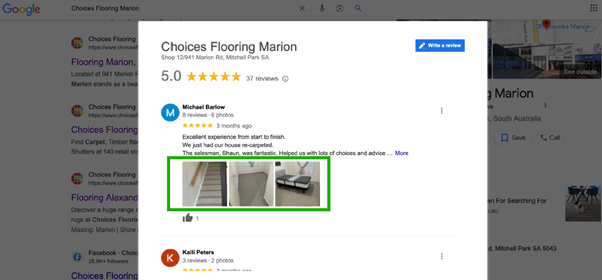 In this example from Choices Flooring Marion. As a relatively new member, Choices Flooring Marion has 37 reviews and some including very happy customers who have posted photos of their flooring renovation. It is recommended store owners respond to reviews with photos and specifically reference how good the photos look. This affirms to the customer the store owner not only shares their delight, but also is a good signal to Google that the review is authentic.